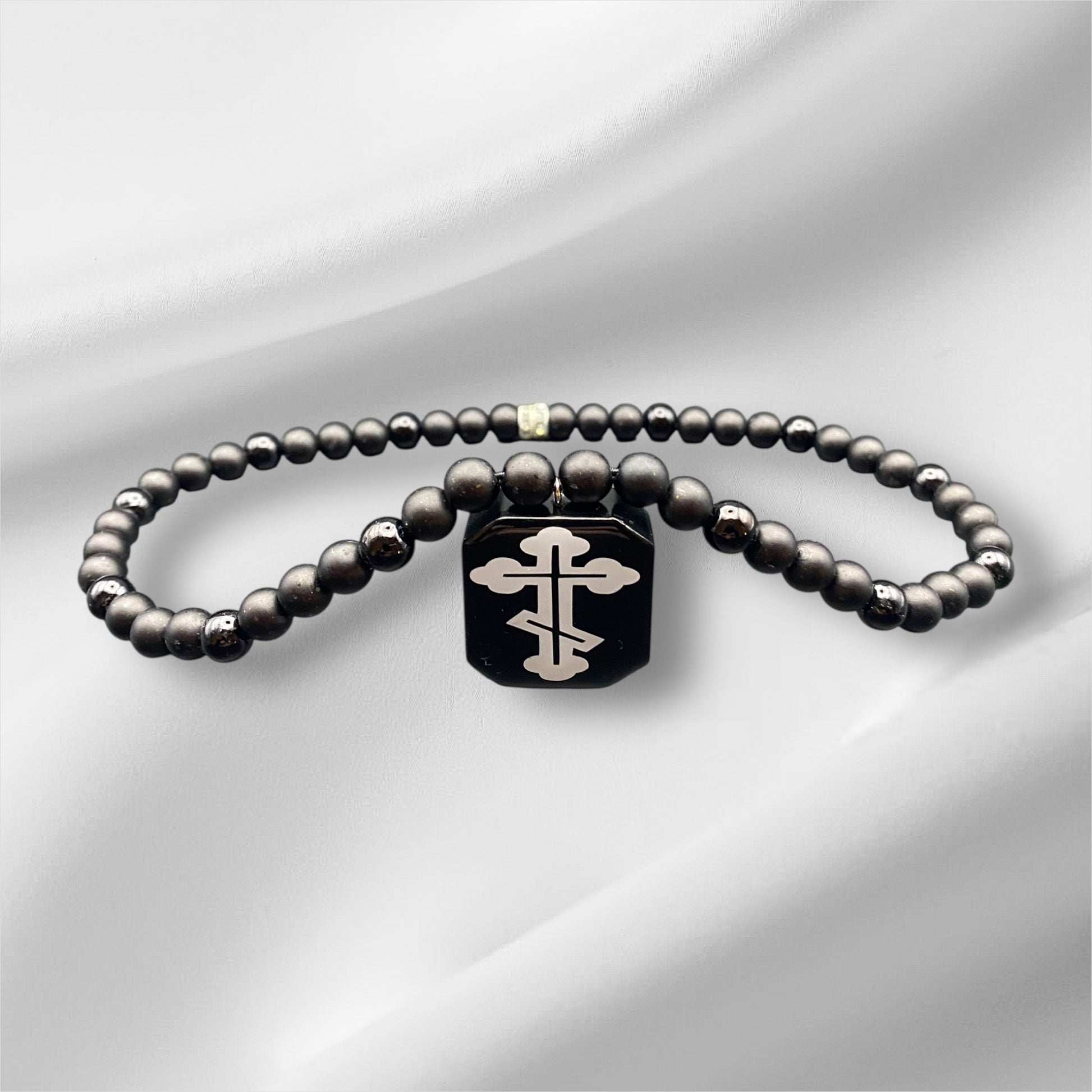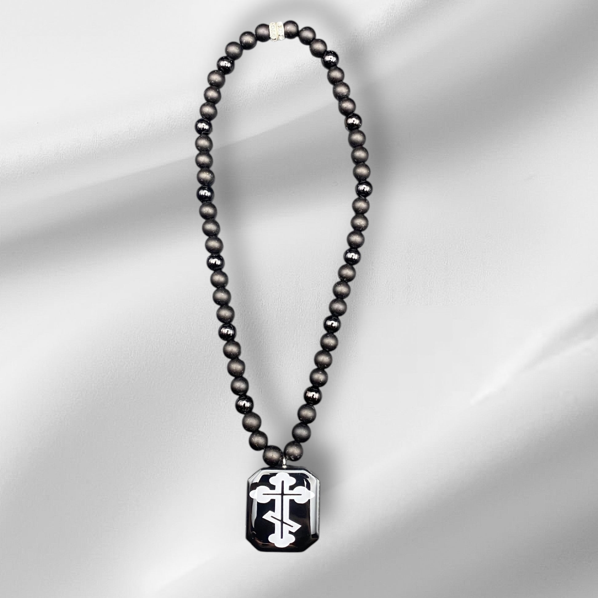 Handgemachte Kette mit 54 Acrylperlen (8 mm) und einem Epoxidharz-Anhänger mit orthodoxem Kreuz. Sie ist 44 cm lang und eignet sich ideal als Rückspiegel-Anhänger. Ein schlichtes und besonderes Accessoire fürs Auto.